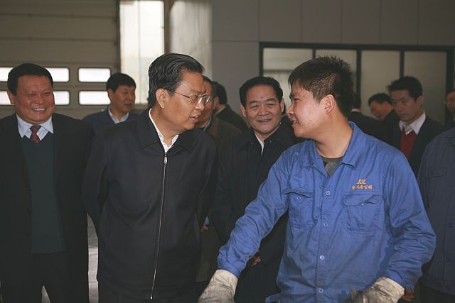 当天上午10时许,赵乐际一行抵达工业园。下车伊始,赵乐际等首先来到钼粉一车间。该车间主要设备是三条德国钼粉生产线,适合大批量生产,自动化程度高,主要生产各种规格的钼粉,产品销往日本、韩国、美国等地。赵乐际等在车间一边参观,一边听取相关人员的介绍和解说,详细了解钼粉生产工艺。 从钼粉一车间出来后,赵乐际等来到钼丝车间。该车间拥有国内最先进的德国进口精锻机Y250轧机,工艺设计为精锻机—Y370轧机—Y250轧机的精锻连轧工艺,主要生产钼电极、钼杆、钼丝等。赵乐际等在车间生产现场兴味盎然地参观了钼丝生产过程,并与现场工人亲切交谈。